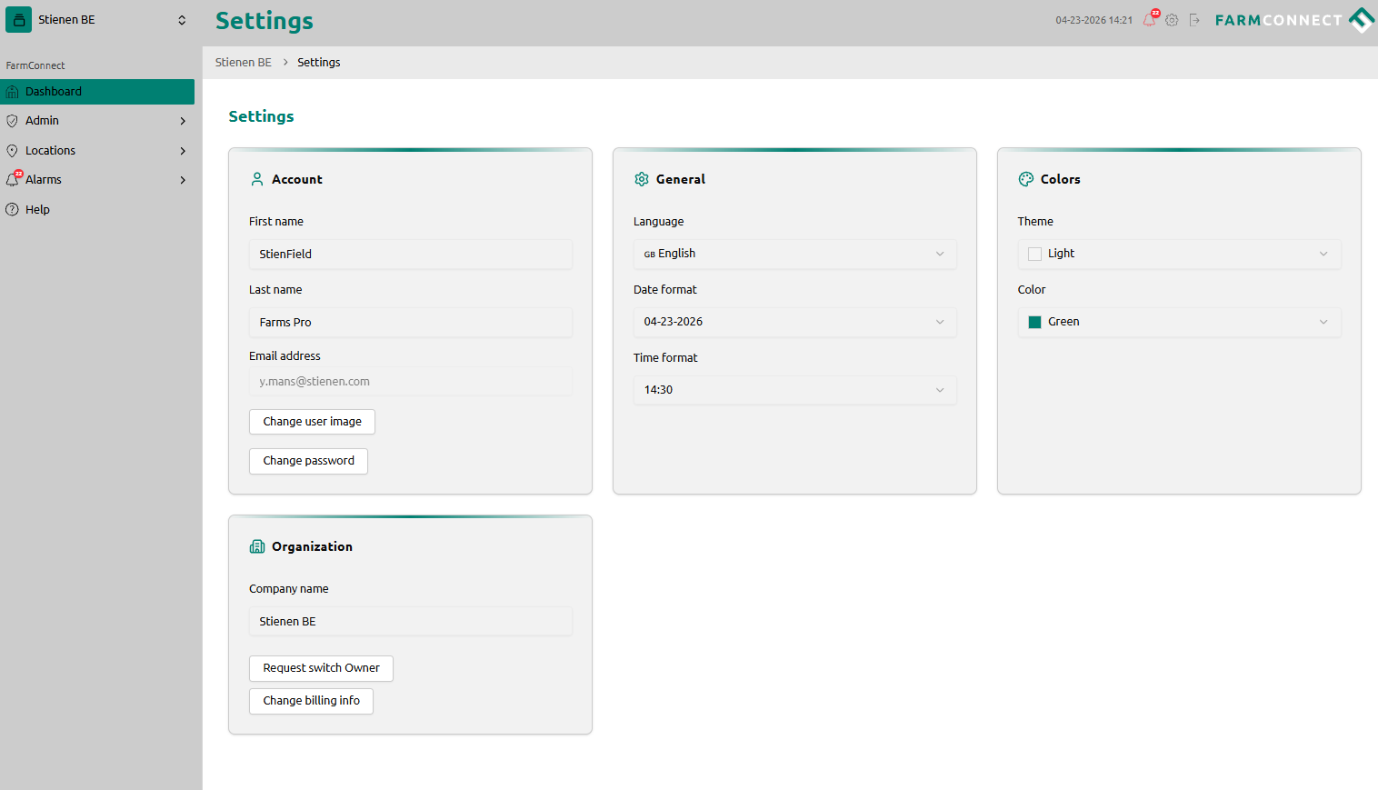 - Under the General tab, you will find the Language setting. Select your preferred language here. This change will be applied to your FarmConnect account.
