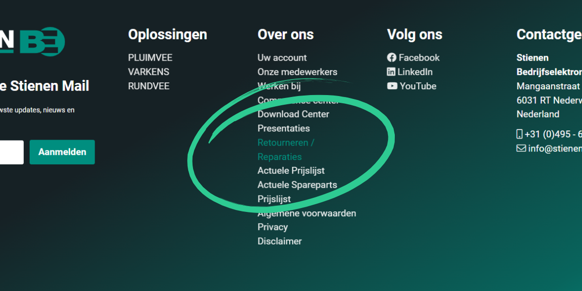 - Ga naar de link: https://www.stienen.com/retourneren-reparaties/. Let op: u dient ingelogd zijn met uw Partner Login.
