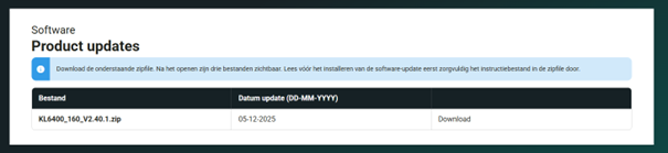 Via de partner-login kunt u zoeken op product en vervolgens op Update. Bijvoorbeeld via KL-6400: